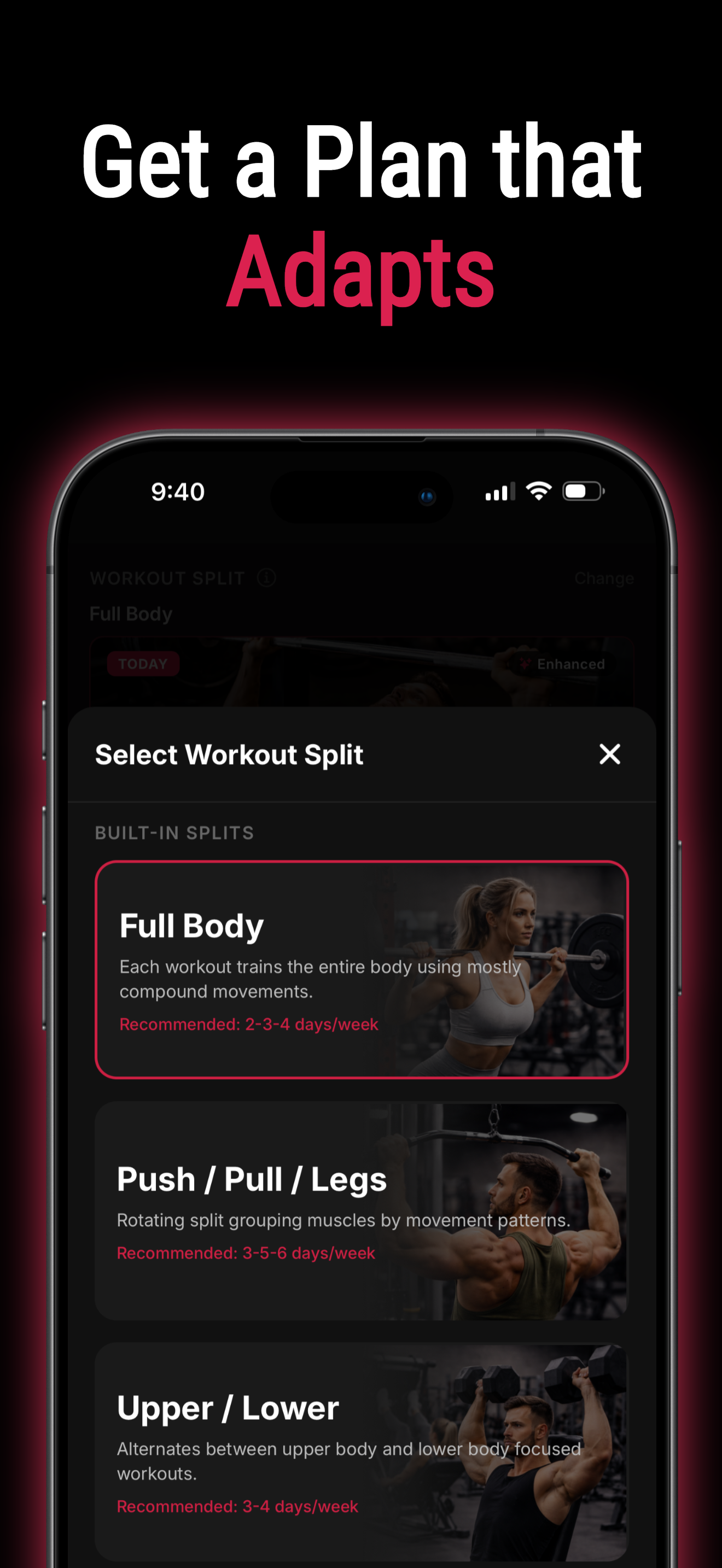 Full Body, Upper/Lower, and Push/Pull/Legs are available on the free tier. Premium unlocks Bro Split, Arnold Split, and other advanced splits.